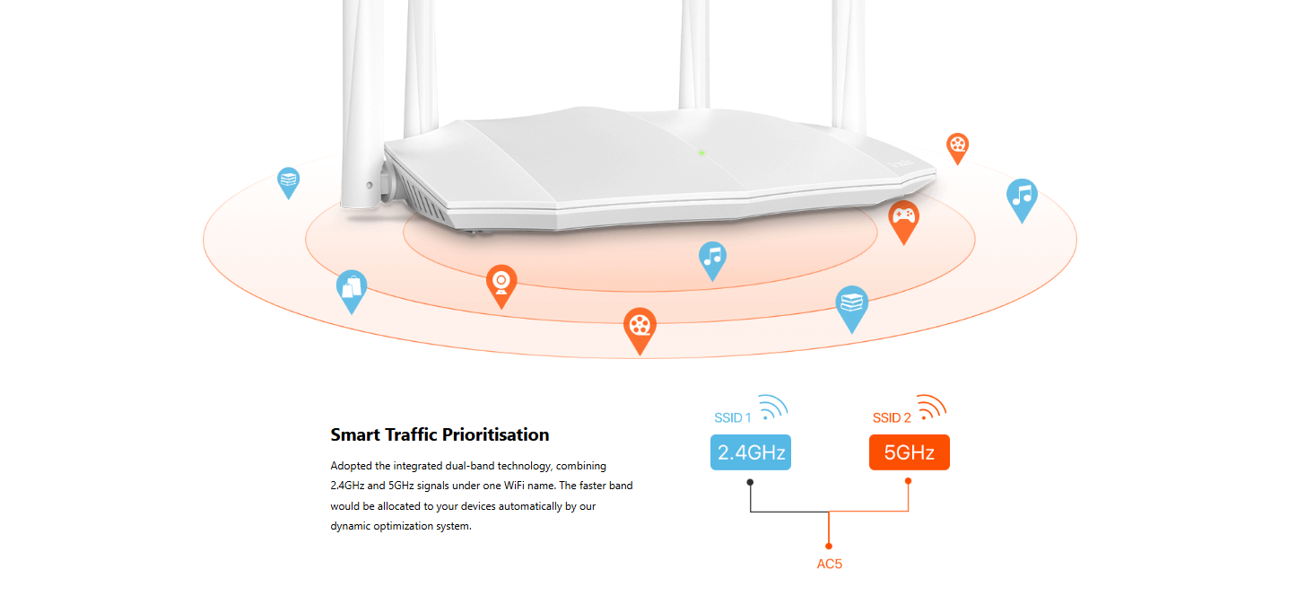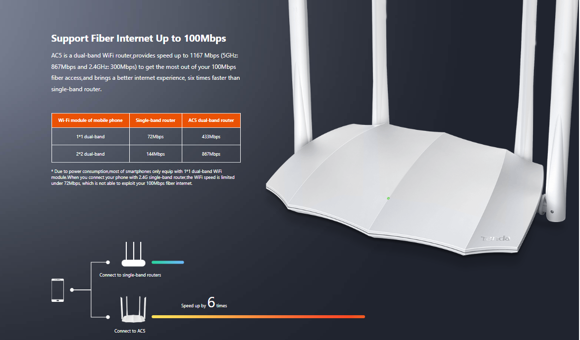 - AC5 is an AC1200 dual band WiFi router, designed for medium-sized apartment with a 100Mbps fiber access. It provides WiFi speed up to 1167 Mbps (5GHz: 867Mbps and 2.4GHz: 300Mbps). Adopted the integrated dual-band technology, combining 2.4GHz and 5GHz signals under one WiFi name. The faster band would be allocated to your devices automatically by our dynamic optimization system. Meanwhile, featured with 4*6dBi high-gain antennas and equipped with a 28nm high performance CPU, it brings a better internet experience. AC5 supports IPv6 protocol, it can reduce the data transmission time and minimize the lag. Furthermore, the remote management function by the Tenda WiFi App provides the easiest way to manage AC5.
